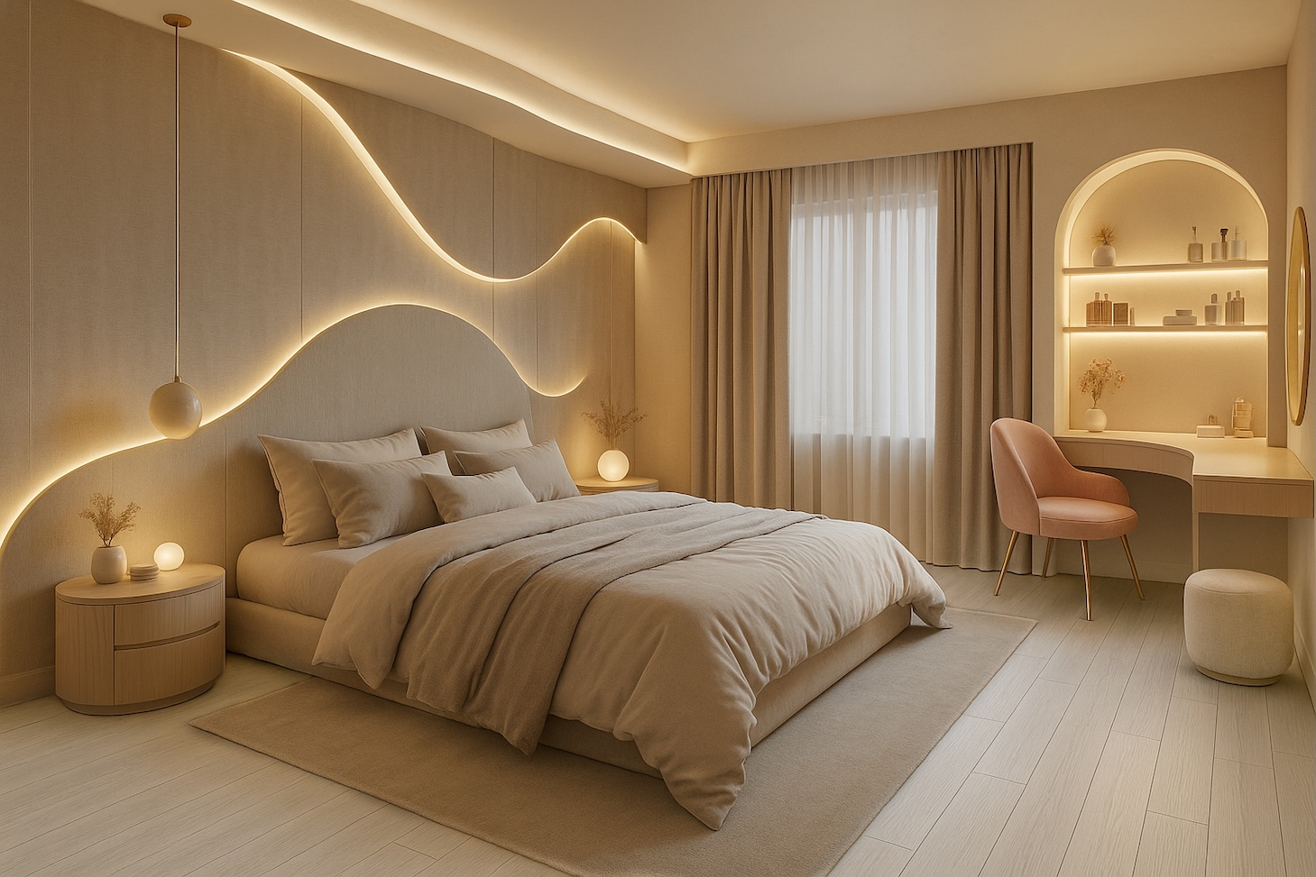 腳踩在溫潤且色澤清透的地板上,照著鏡子梳妝,